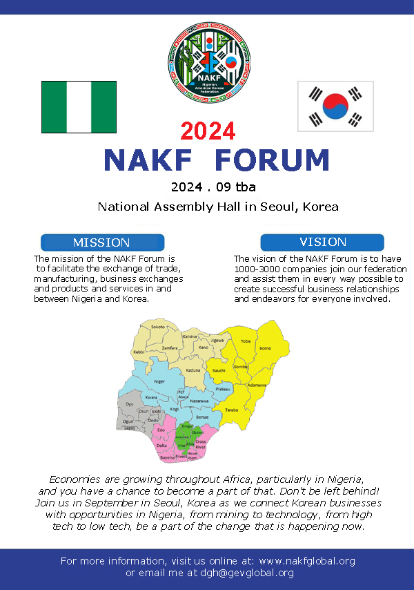 In September 2024, the Nigerian American Korean Federation will hold the Nigerian American Korean Economic and Cultural Exchange Forum in the National Assembly Hall in Seoul, Korea. Contact us if you'd like more information.